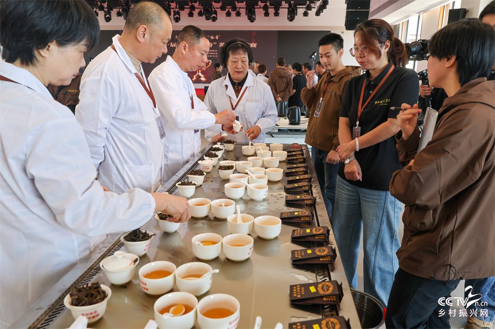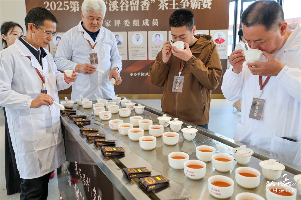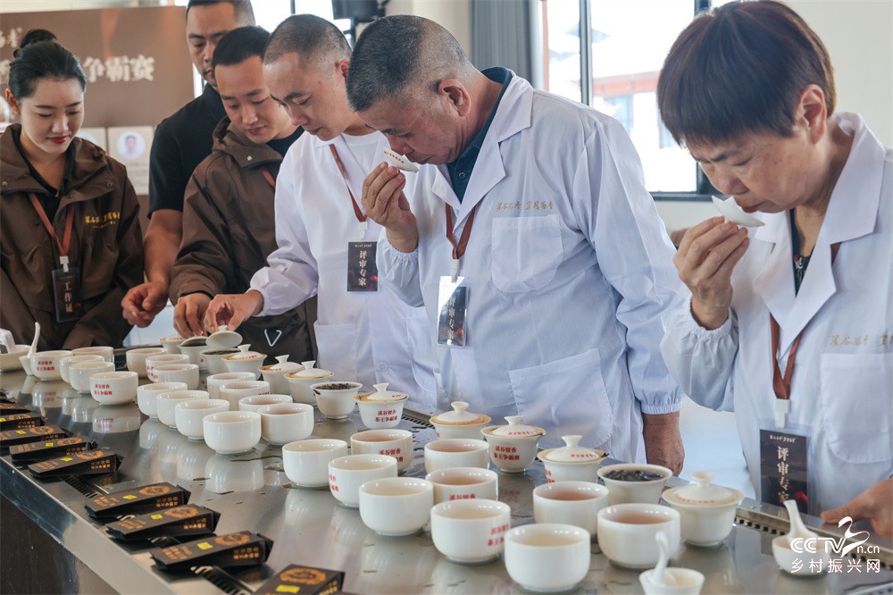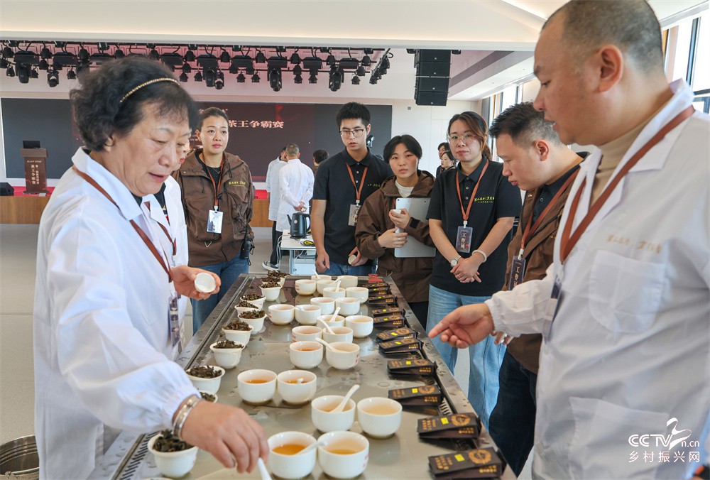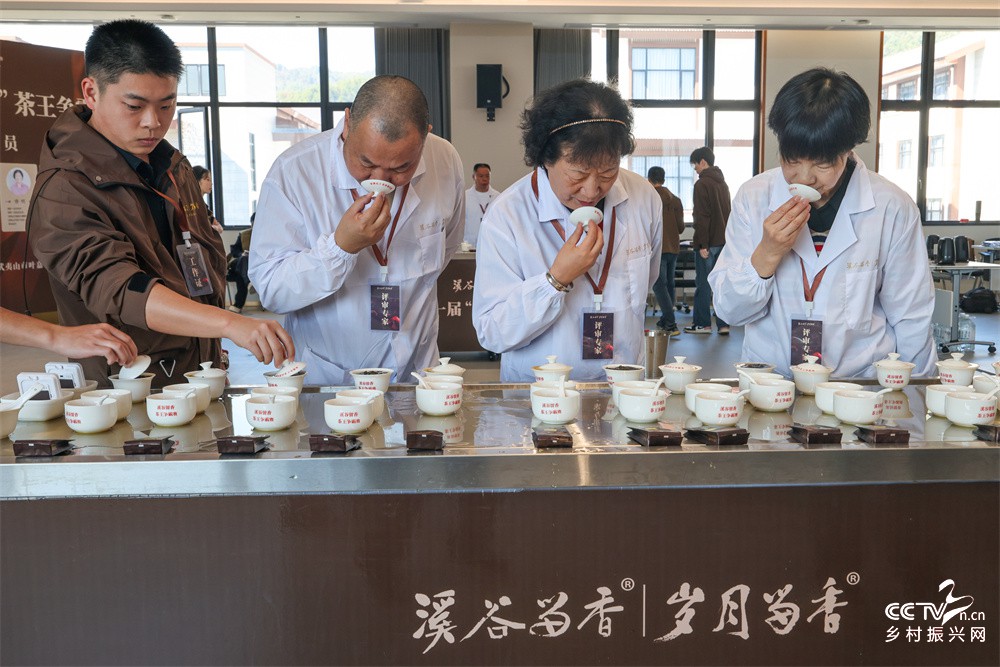 11月15日,专家评委与助泡在“溪谷留香”茶王争霸赛决赛上评茶。