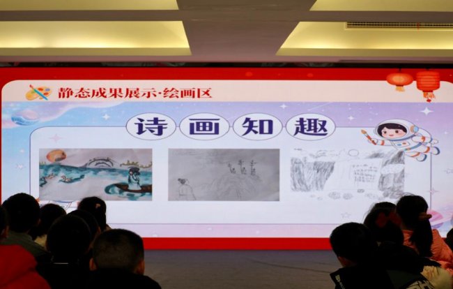 结业仪式在充满年味的喜庆氛围中展开。“启礼暖场”环节里,孩子们的欢笑声驱散了冬日的寒意,也正式拉开了这场美育成果盛宴的帷幕。在“成果展示”环节,“笔韵书香”书法区吸引了众多目光,孩子们书写的楷书、隶书作品或娟秀工整,或舒展大气,一笔一划间尽显专注与沉淀;“诗画知趣”绘画区更是色彩纷呈,水彩画、素描作品勾勒出孩子们眼中的奇妙世界,既有充满童真的幻想场景,也有对经典诗作的细腻描绘。