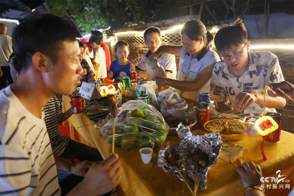 当晚,武夷山市星村镇黄村村举办百桌茶宴庆中秋活动,游人和村民在百桌茶宴上赏月、品茶赏美食。