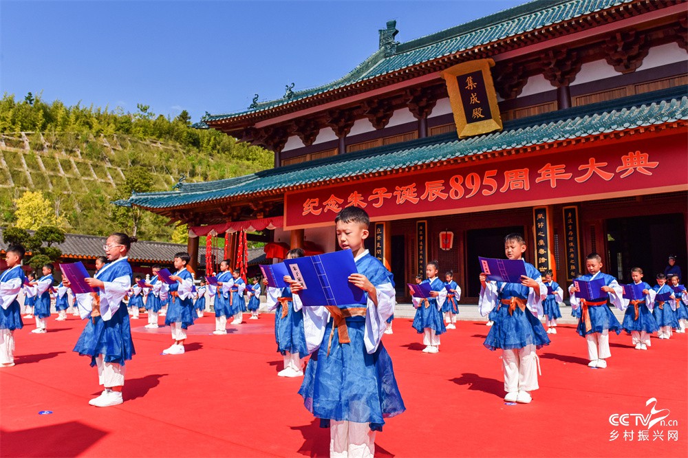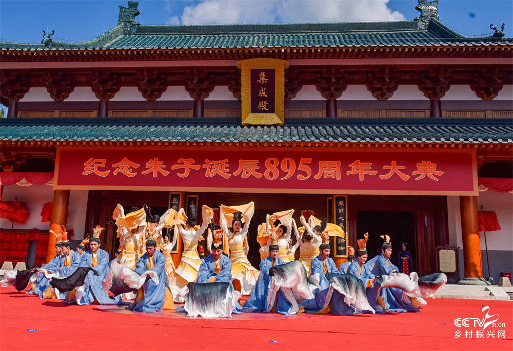 当日,纪念朱子诞辰895周年大典在朱子故里五夫镇隆重举行,近千名来自海内外的专家学者、朱子后裔、学生代表、社会群众等齐聚一堂,共同礼敬朱子,传承弘扬中华优秀传统文化。随着鸣赞声“公祭朱子大典 ——”响起,大典正式开始。活动按朱子祭祀大典的流程依次进行,全体参祭人员共同向朱子行天揖礼,六十名礼生手执书卷,齐声诵读《朱子家训》,全体跟读。嘉宾代表依次向朱子像敬献花篮,社会各界人士向朱子像敬献桂枝,深切表达对先贤圣哲的缅怀之情。