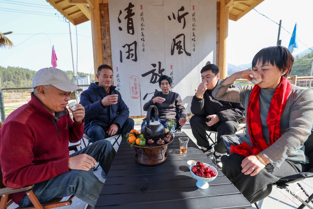远处的连绵山峦,阳光洒在身上,仿佛给每个人都披上了一层金色的纱衣 。偶有微风拂过,带来淡淡的青草香,与茶香交织在一起,构成了一幅宁静而美好的冬日休闲画卷 。