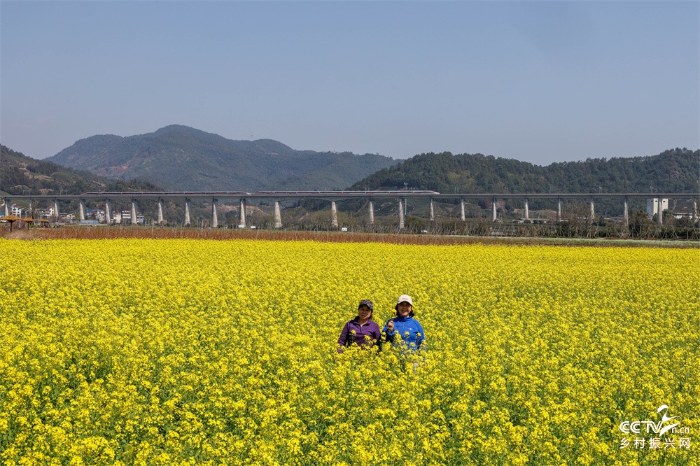 3月10日,高铁沿着高架轨道穿行于武夷山市兴田镇南岸村油菜花海。