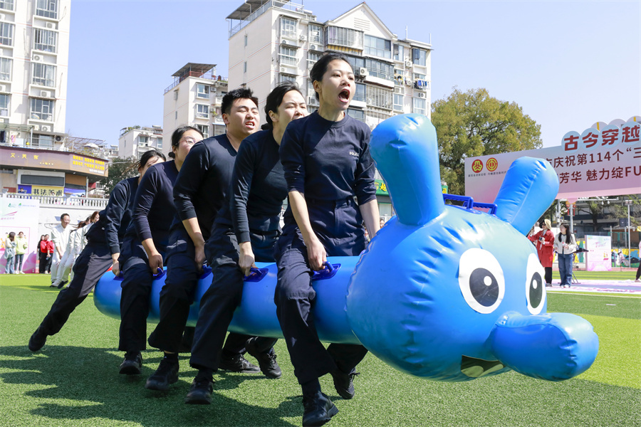 图四、3月8日,参加武夷山市举办的庆祝第114个“三八”国际妇女节趣味运动会的选手进行毛毛虫比赛。