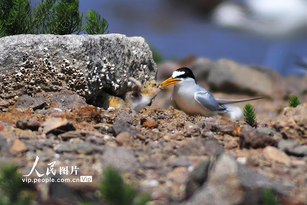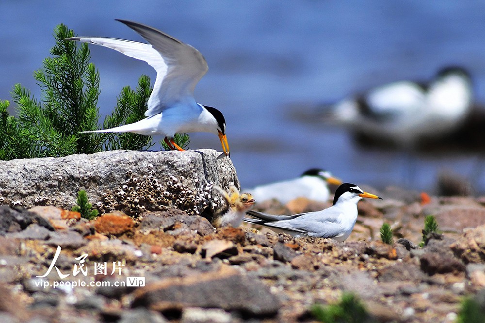 夏日时节,在山东省青岛市城阳区河套街道滨海湿地一处退养的虾池中,白额燕鸥等水鸟正在孵化育雏,滩涂生态修复成效显著。