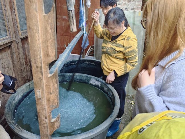 活动中,锦绣苗疆队全体队员在非遗传承人龙智先老师的技术指导下,深度参与苗族蜡染制作的完整流程,重点是制作蜡染核心环节——大染缸的奥秘。周黎艳带领队员们围绕大染缸,依次参与熔蜡、点蜡、浸染、固色、脱蜡、漂洗等全环节操作。龙诗雅重点钻研染色环节,再让当前反复尝试把控布料的浸泡时间,仔细观察布料上色的深浅变化,记录不同浸染次数对应的色彩效果。队员们在亲身体验中系统掌握了蜡染各工序的核心要点,真切体会到苗族蜡染技艺中蕴含的匠心与智慧,读懂了非遗文化代代传承的精髓。