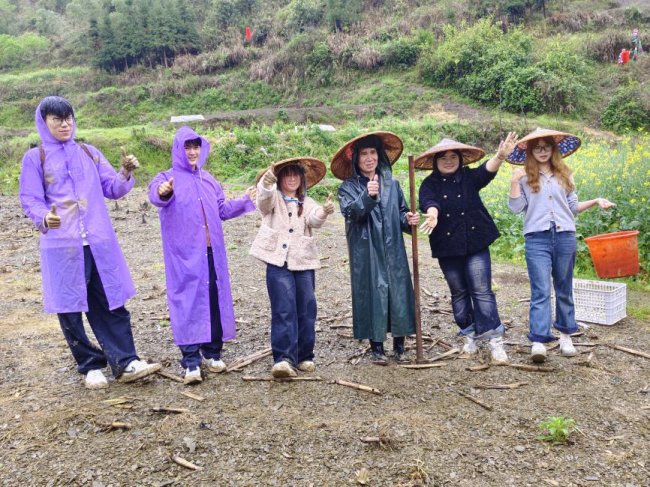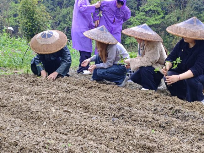 在完成蜡染制作实践后,锦绣苗疆队在项目核心成员与当地技术人员的带领下,走进大湾村的田间地头,参与蜡染核心原料板蓝根的种植实践。周黎艳带领队员们分工协作,有的搬运板蓝根幼苗、有的挥锄翻土挖坑、有的按规定的行距和棵数摆放幼苗,有的按照顺序和泥土覆盖苗的深度种植,严格遵循种植要求,认真完成从备苗到定植的每一个步骤。劳作中,队员们边实践边总结,慢慢掌握了板蓝根种植的田间技巧,也深刻感受到原生态、纯天然蜡染古朴的魅力以及乡村特色产业发展的价值。