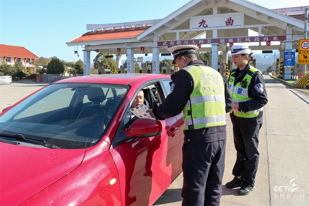 图三至图五、1月13日,南平高速交警支队五大队与武夷山市公安局交警大队景区中队民警在武夷山九曲高速路口向过往车辆驾乘人员讲解如何保障春运安全法律法规。