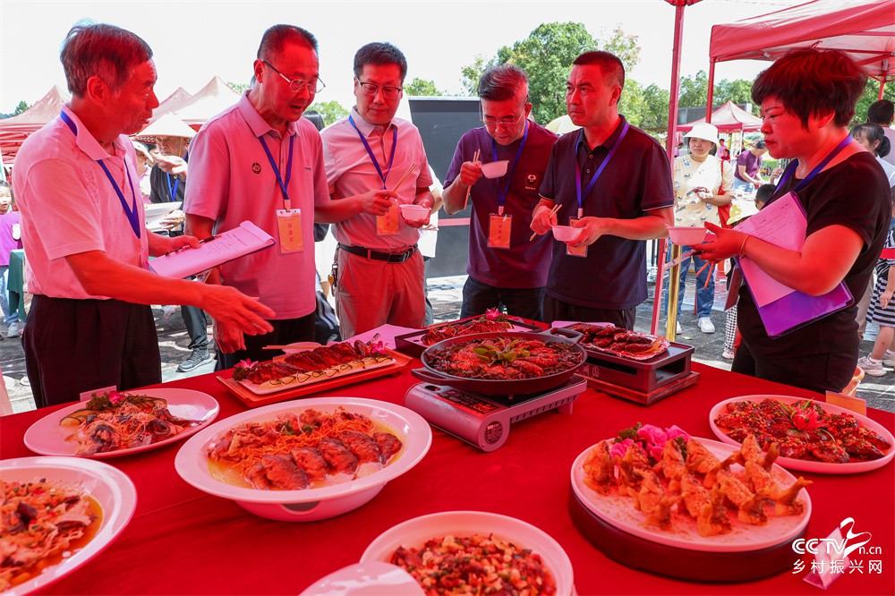 图九、9月28日,烹饪专家评委在吴屯乡“吴屯稻花鱼”菜品创新烹饪大赛评品“吴屯稻花鱼”。