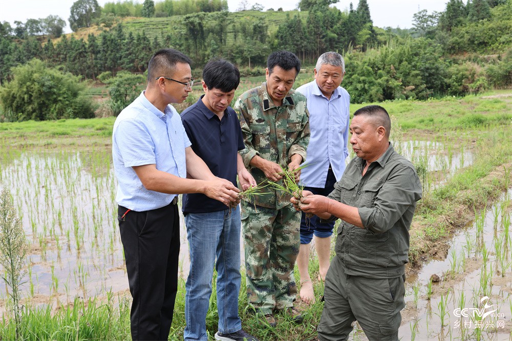 图三、6月5日,武夷山市兴田镇科技人员到乡土科技特派员张建文(右一)的撂荒地水稻种植基地指导田间管理。