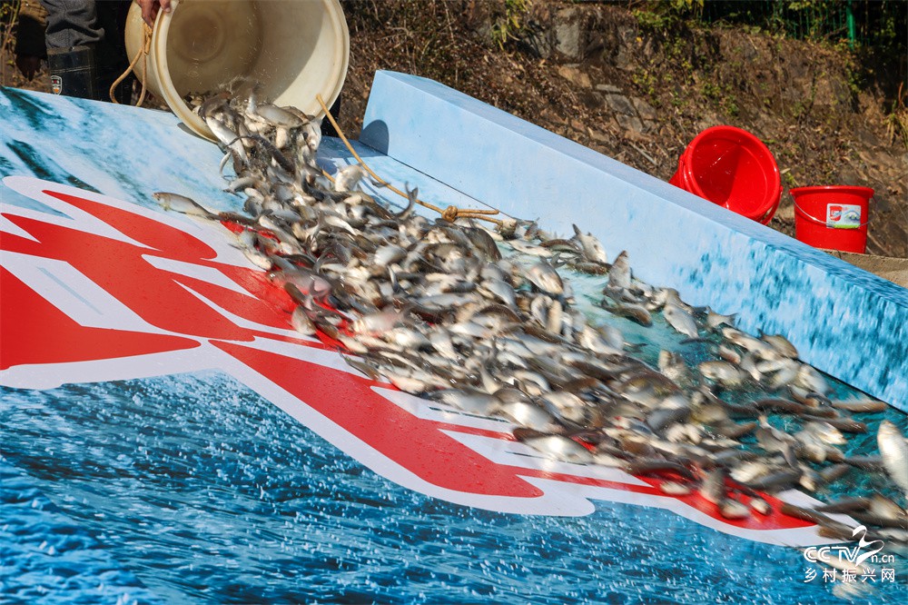 11月21日,武夷山市农业农村局工作人员在闽江上游崇阳溪东溪投放鱼苗。