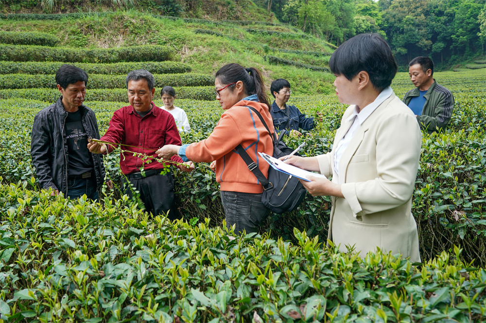 图四、图五、4月12日,福建武夷山市农业农村局、各乡(镇)科技人员在顷上生态有机茶山指导绿肥种植。