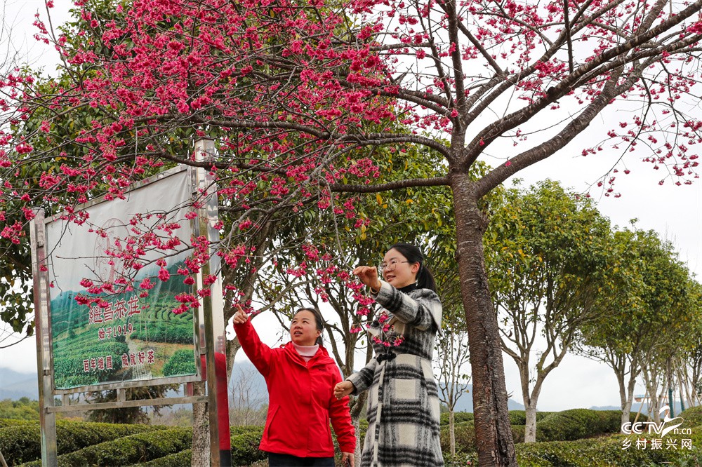 乡村振兴网福建讯(邱汝泉 摄影报道)2月23日,游人在福建武夷山南源岭仙茗岩茶生态茶园观赏樱花。