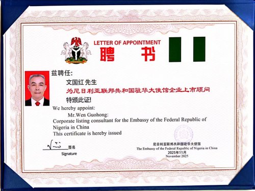 作为会谈的重要成果,蒂贾尼·穆萨大使正式聘请文国红主席担任尼日利亚驻华大使馆的企业上市顾问。在庄重的仪式上,大使向文国红颁发了聘书,表彰其在企业上市和中尼交流中的杰出贡献。文国红主席接受证书时表示,这将是一份荣誉与责任,他承诺将尽职尽责,推动更多尼日利亚企业对接全球资本市场。